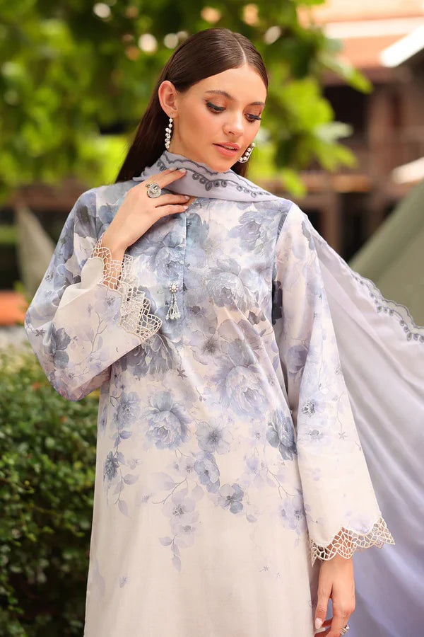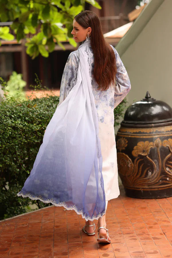 This elegant set features a digitally printed lawn shirt and trouser, complemented by an embroidered organza front and sleeves border for a refined touch. The chiffon dupatta is digitally printed and finished with an embroidered organza border, adding delicate detail. Perfect for staying comfortable and stylish in warm weather, this ensemble combines breathable fabrics with intricate craftsmanship.